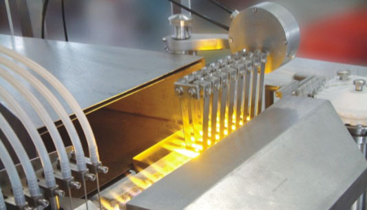 The machine adopts straight line, an intermittent filling and sealing. From the bottle dry machine sterilization went through into the bottle with filling sealing machine sent to the transmission parts, twisted dragon wring dragon will be disorderly state went up the bottle into the separation of orderly state and will advance one bottle went to enter bottles dial the wheel, enter bottles dial the wheel will be submitted to bottle went for went before the beam parts, went before the beam parts will again went into a continuous movement bottle intermittent movement way among sent to walk and then went steps beam into the way the following five in turn sent to the station before filling nitrogen, irrigation, liquid, nitrogen, preheating, filling after drawing sealing work station. In filling stations, and may, according to the user n the needs of their products tailored before filling stations are available nitrogen, set to blunt the compressed air, also can be set to blunt other inert gas, filling station after nitrogen is set to blunt inert gas; In filling liquid location, DuoGe glass piston pump through the irrigation needle injection, the solution will be filling with pump went by adjusting the quantity can adjust the handwheel; Bake at stations, went bottle mouth blow out of the fire and the burning liquid gas oxygen gas heating mixing, and the influence of the wheel spin movement, drawing sealing location in the top, went further heated by drawing wire clip softening, seals and sealing of the mouth of the bottle after bottle of dial out went round is pushed into a bottle tray, can also pick up according to the requirements of our customers with mixed gas as gas hydrogen.